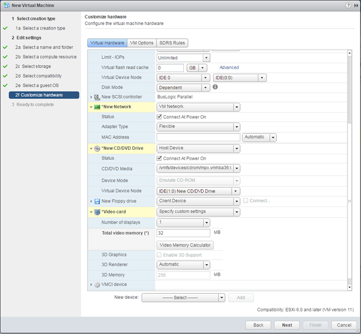 Open your VMware vSphere Client, then Create a new Virtual Machine ( I used Version 11).